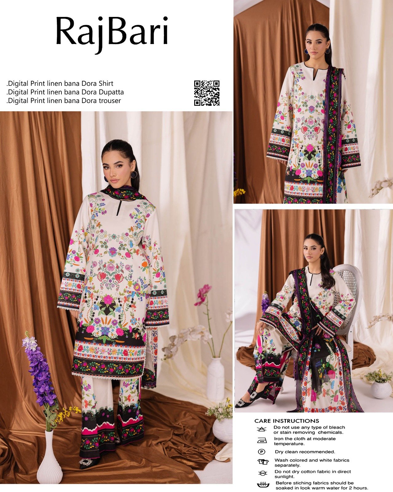 Raj Bari Digital Print Linen Bana Dora 3-Piece Suit is a perfect blend of elegance and comfort. It features a beautifully designed digital print linen bana dora shirt, paired with a matching bana dora dupatta and a stylish linen trouser.